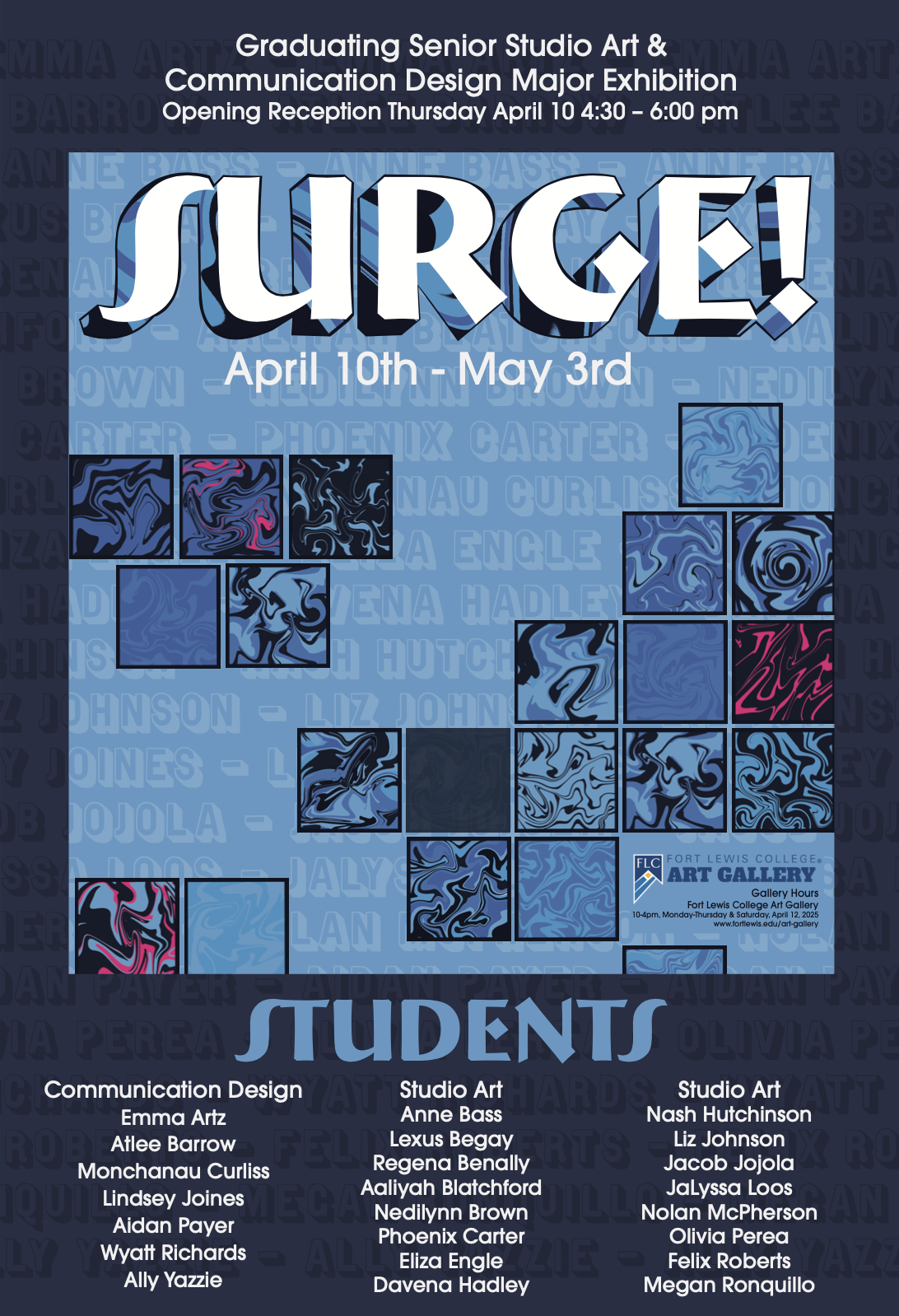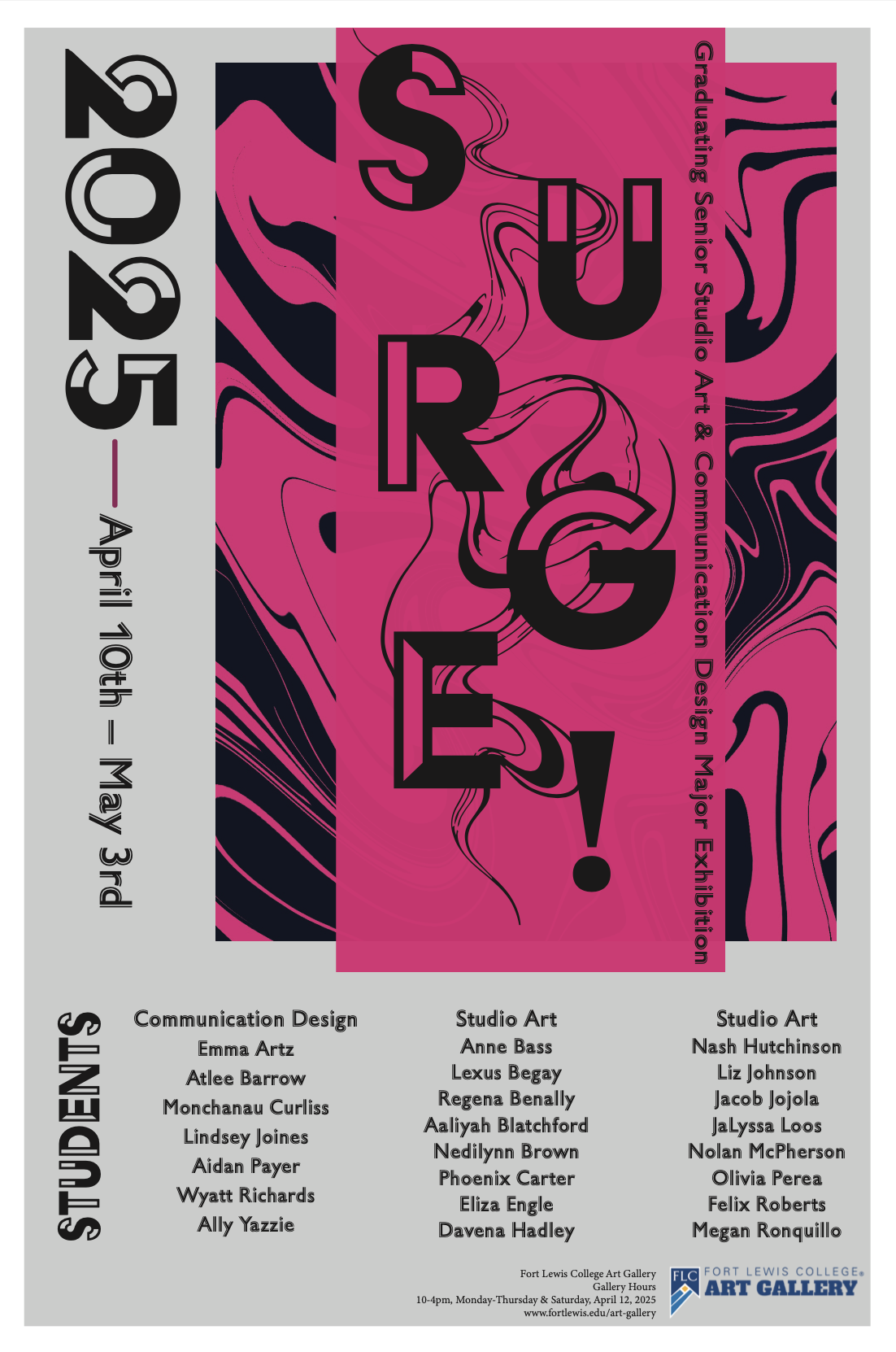 Two different promotional posters that were designed for my senior gallery show. Focusing on bright colors to draw the audience in, along with being topographically heavy due to the large number of graduating seniors.