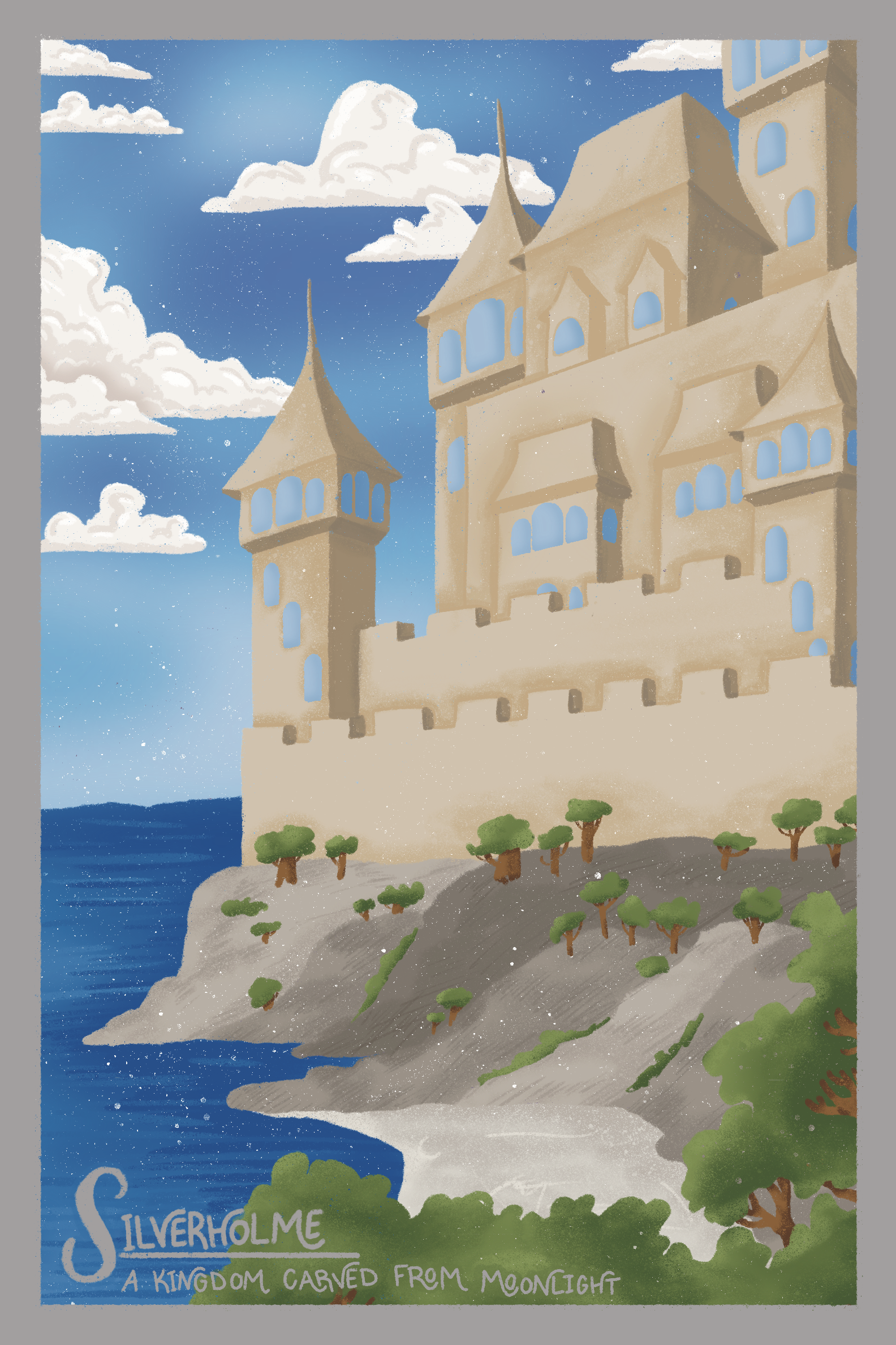 Based on a fictional world from a book series that I am currently writing. It features the world’s two main kingdoms, Silverholme and Shadowspire, and their defining landmarks.