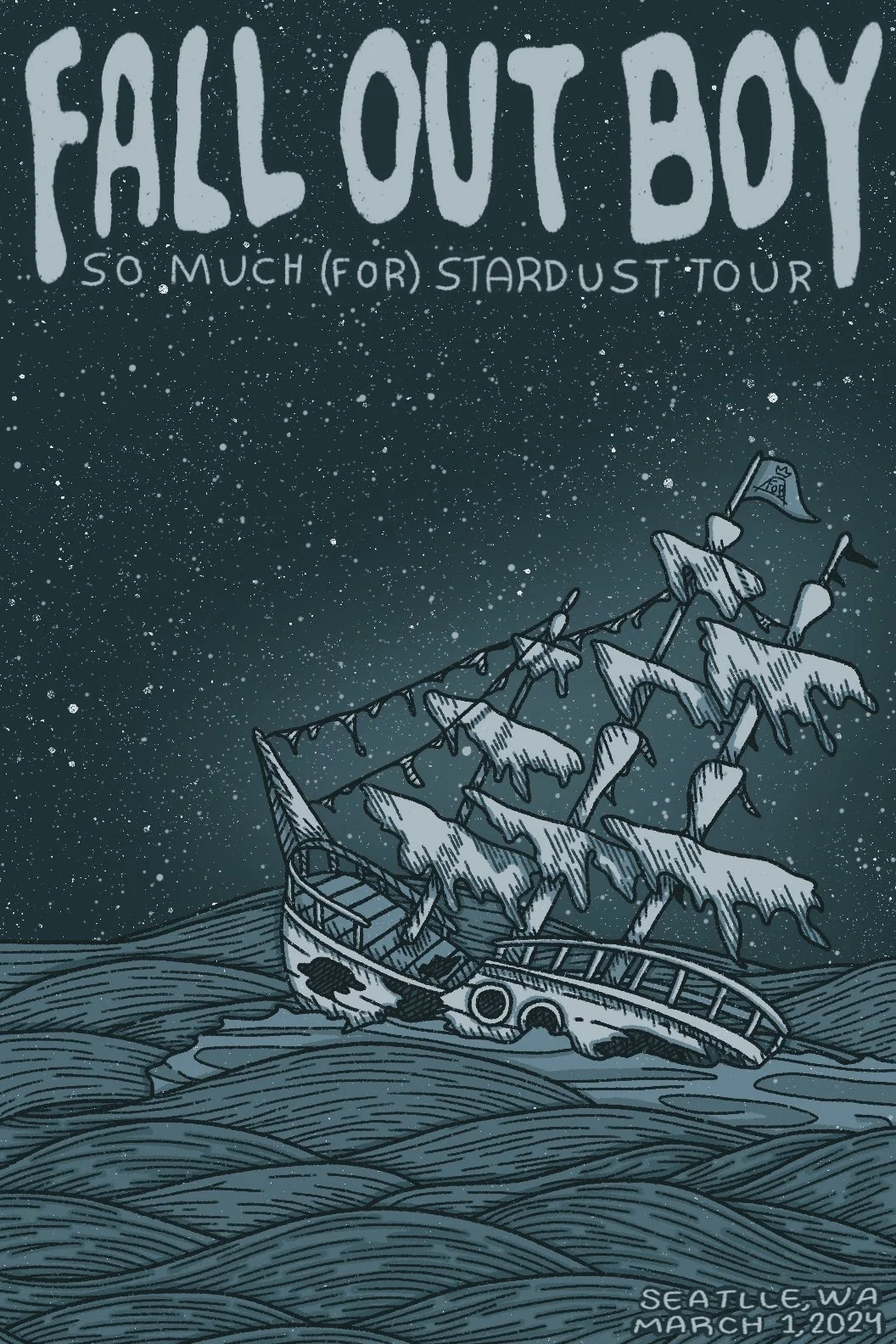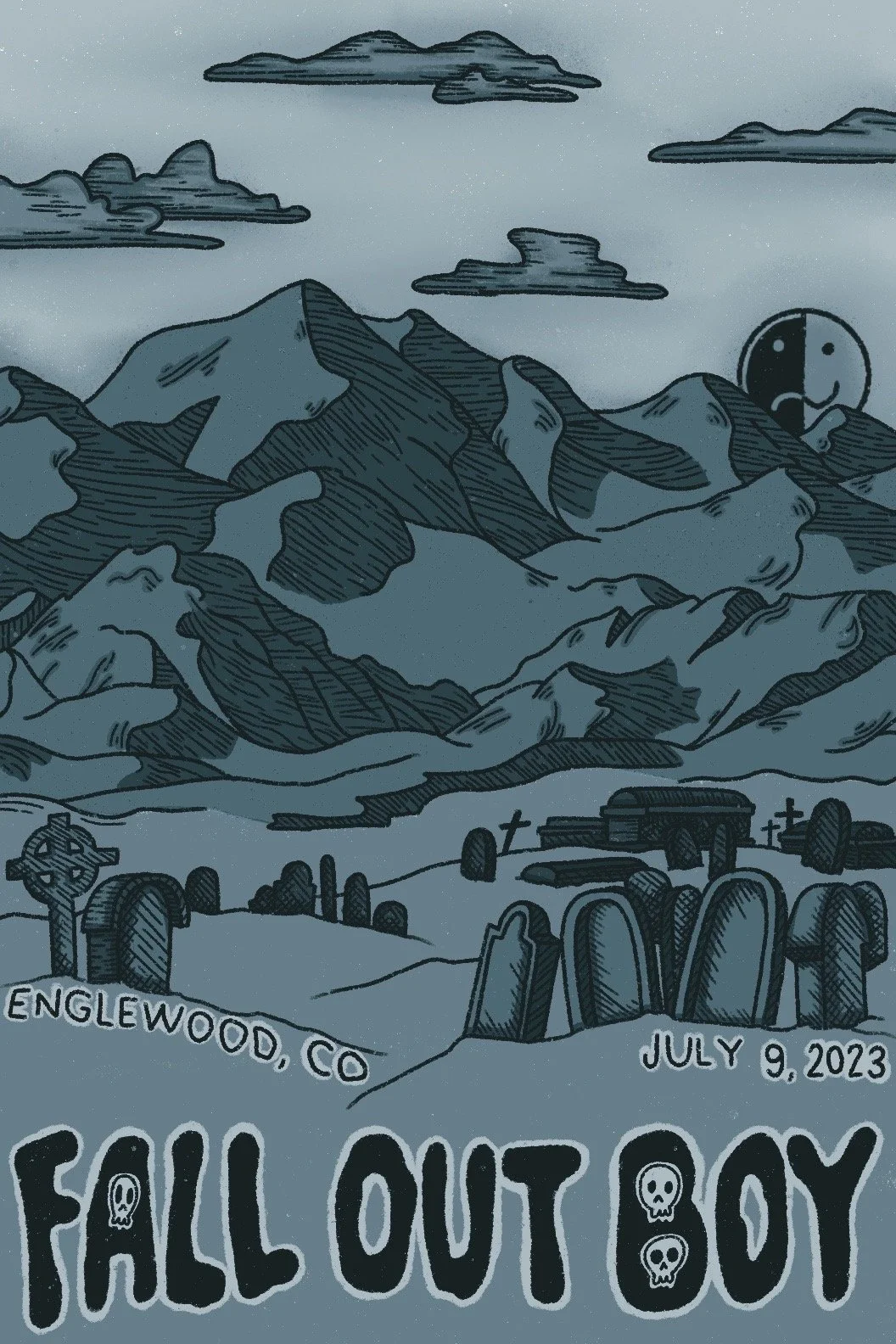 A poster design for two Fall Out Boy concerts, one in Englewood, CO, and the other in Seattle, WA (which is the concert I went to!). During the concert, they talked about how this new album they were touring for was about the inevitability of death and coming to terms with it. I wanted to incorporate that theme into my posters, while also including some recognizable Fall Out Boy icons.